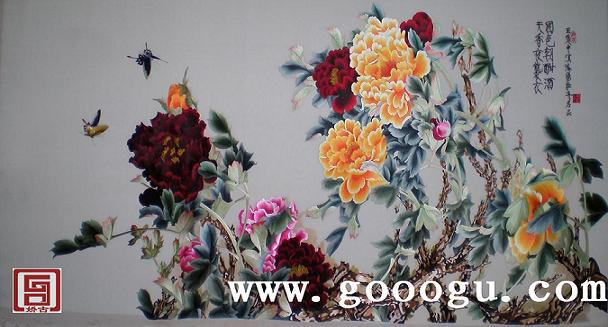 牡丹刺繡畫|蘇繡壁畫|大型手工刺繡掛畫