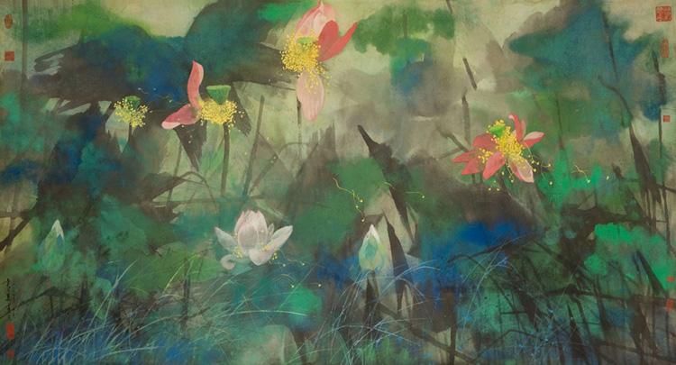 為了展現(xiàn)中華名族的蘇繡文化,蘇繡的作品開(kāi)始進(jìn)入國(guó)家政治場(chǎng)所,在人民大會(huì)堂有蘇繡的作品,蘇繡也不僅一次的作為外交禮品贈(zèng)與國(guó)外元首。隨著香港回歸祖國(guó),外交部駐港機(jī)構(gòu)也需要裝飾布置。為了體現(xiàn)我國(guó)的優(yōu)秀傳統(tǒng)文化,有關(guān)部門決定采用四大名繡之一的蘇繡作為該機(jī)構(gòu)貴賓室內(nèi)的陳設(shè)品。選用的畫稿是由中央工藝美術(shù)學(xué)院教授袁運(yùn)甫設(shè)計(jì)的《彩墨荷塘》,這幅畫采用虛實(shí)亂針繡和平針中各種針?lè)ㄏ嘟Y(jié)合的多種針?lè)?,既?jiàn)粗獷筆墨,又有細(xì)致刻畫,精心繡制成雙面異色亂針繡《彩墨荷塘》,高1.1米。寬2.3米。原作以大膽老辣的中國(guó)傳統(tǒng)潑墨和西洋絢麗濃艷的色彩,描繪了一副生機(jī)黯然的荷塘景色,繡工使用了五百多種色線,真實(shí)地反映了原作的精髓,既強(qiáng)調(diào)了光色效果,又很好地處理了虛實(shí)搭配。繡面上粉紅色、白色的荷花亭亭玉立,金黃色花蕊中幾支嫩綠色的蓮蓬清香遠(yuǎn)溢,碧綠的田田荷葉在深藍(lán)底色的烘托下色彩交相滲透,枝干、細(xì)草、慈姑葉有的掩映在荷葉中,有的錯(cuò)落有致地呈現(xiàn)在荷葉叢間,富有生氣地展示了仲夏荷塘的清麗之美。這還是至今最大的雙面繡亂針作品。