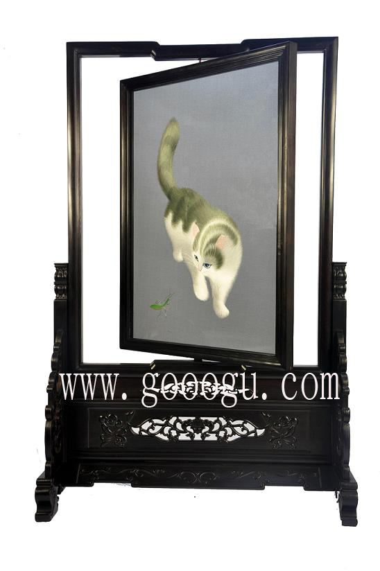 走進(jìn)嬌古蘇繡的展廳,我們驚嘆于陳列室里作品的浩繁與精致,先來(lái)看傳統(tǒng)題材的作品?;B繡是蘇繡傳統(tǒng)產(chǎn)品,它是明清時(shí)期閨閣繡的延續(xù)。蘇繡工藝品《小 貓》、《金魚》曾在國(guó)際上得獎(jiǎng),《小貓》的名氣在于貓眼用二十六種不同顏色的絲線繡成;《金魚》的輝煌則是魚尾最細(xì)處僅用一根線的四十八分之一。蘇州各大 旅游景點(diǎn)也屢見小貓金魚的姿態(tài),如何擺脫蘇繡工藝品的匠氣,使俗氣的工藝品成為震撼人心的藝術(shù)品,這是嬌古蘇繡多年來(lái)苦苦研究的問(wèn)題??矗@幅現(xiàn)代 刺繡藝術(shù)品《貓》。同樣是貓,傳統(tǒng)的貓講究具體,形象,栩栩如生。而我們面前的兩幅《貓》:一幅白底白貓,一幅黑底黑貓。貓?jiān)谀睦??貓?jiān)诎咨铮堅(jiān)诤谏?里,貓?jiān)谀銦o(wú)盡的想像里。想像之上,具象已與抽象結(jié)合起來(lái),達(dá)到了藝術(shù)升華。同是蘇繡作品,構(gòu)思變了,功底卻不改,《貓》作品之外給人的聯(lián)想可謂余音裊裊。 |
