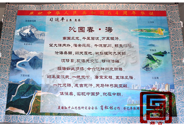 為紀(jì)念中華人民共和國(guó)成立64周年,由美國(guó)孫中山研究協(xié)會(huì)會(huì)長(zhǎng)肖松林先生獻(xiàn)禮慶典的蘇繡作品由嬌古蘇繡承接并安排專項(xiàng)組設(shè)計(jì)制作,這幅作品采用滿繡的工藝制作,作品中的詞《沁園春 ?!酚擅珴蓶|的《沁園春 雪》改編而來,在整幅畫中有三沙市、釣魚島、長(zhǎng)城等畫面,表現(xiàn)了對(duì)祖國(guó)大好河山的贊美之情。