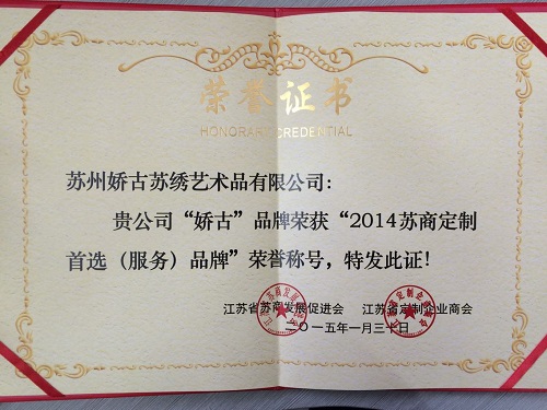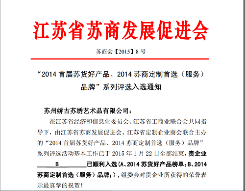 在江蘇省定制企業(yè)商會(huì)副會(huì)長(zhǎng)兼秘書長(zhǎng)俞文勤的主持下,蘇貨好產(chǎn)品百?gòu)?qiáng)榜單當(dāng)天發(fā)布,嬌古蘇繡藝術(shù)品有限公司的產(chǎn)品在經(jīng)過(guò)專家組的層層選拔之后脫穎而出,獲得2014蘇商定制(服務(wù))品牌榮譽(yù)稱號(hào),它們是江蘇制造的震撼力量,也是鮮活具體的蘇貨映像。大會(huì)還啟動(dòng)了2015蘇貨網(wǎng)上行工程,邁出了蘇貨借助互聯(lián)網(wǎng)平臺(tái)搭建一場(chǎng)永不落幕的展銷會(huì)的實(shí)質(zhì)性一歩。 |