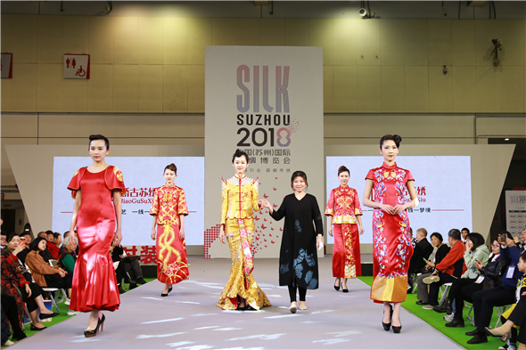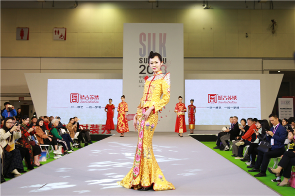 于蘇州博覽中心開(kāi)展的為期三天的2018中國(guó)(蘇州)國(guó)際絲綢博覽會(huì)已謝幕,展會(huì)上精品與亮點(diǎn)頻出,蘇繡作為兼具實(shí)用性與觀賞性的中國(guó)國(guó)粹,乃是本次國(guó)際絲綢博覽會(huì)上展出的重頭戲。 其中,嬌古·孔蒙“燦時(shí)”秀場(chǎng)在4月5日上午10:15分進(jìn)行的新品發(fā)布引起了廣泛的矚目。作為出品方的嬌古蘇繡已是第三次參加絲綢博覽會(huì),此番攜手原創(chuàng)設(shè)計(jì)師孔蒙聯(lián)合推出多款蘇繡定制婚服新品,則賺足了人氣,迅速成為業(yè)界熱議的中心,而價(jià)值28.8萬(wàn)的蘇繡定制婚服初次亮相更將現(xiàn)場(chǎng)掀起一輪高潮,為觀眾帶來(lái)了嶄新而震撼的蘇繡體驗(yàn)。 據(jù)了解,這件價(jià)值28.8萬(wàn)的褂皇從設(shè)計(jì)到成衣,前后花費(fèi)的時(shí)間一年,涉及十幾道制作工序,全程皆由手工完成,整體設(shè)計(jì)除了匯萃蘇繡工藝精髓之外,還蘊(yùn)含著“幸福美滿、稱心如意、龍鳳呈祥、青云直上”等多重寓意。