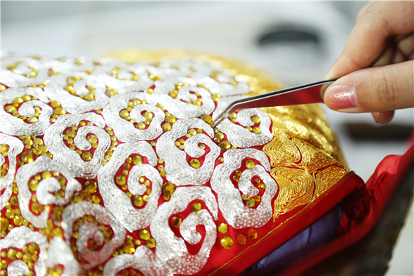 褂皇通身牡丹造型,配以盤(pán)金繡花,象征著滿身富貴;胸口至肩膀處祥云環(huán)繞,與胸口相平,乃是心胸開(kāi)闊、心平氣和;而肩膀開(kāi)口在結(jié)合傳統(tǒng)設(shè)計(jì)的基礎(chǔ)上進(jìn)行創(chuàng)新,以翹起突出青云直上之意;袖口底擺鋪滿水紋,波光粼粼,以示順風(fēng)順?biāo)?。另外通身金牡丹中繡有花瓶與如意,為稱心如意、平平安安;上身胸口左右龍鳳盤(pán)旋,采用立體繡法繡出龍鳳呈祥的意境;胸口、肩膀、領(lǐng)口處更是嵌入上千顆黃金水鉆,與銀色祥云相得益彰,如金鑲玉。