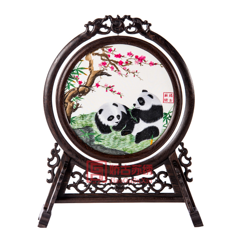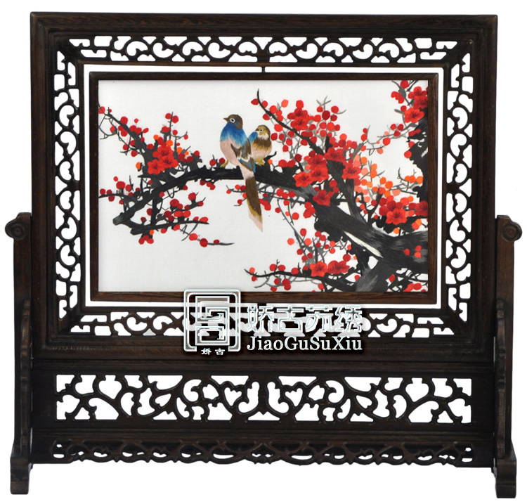 嬌古蘇繡16X25CM雞翅木雙面繡橫座屏,手工刺繡工藝品饋贈老外特色禮品