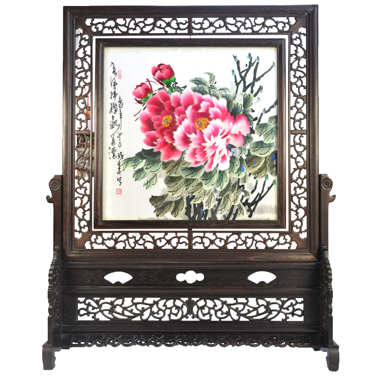 寫(xiě)意牡丹擺件雙面繡雞翅木框架古典工藝品蘇州刺繡