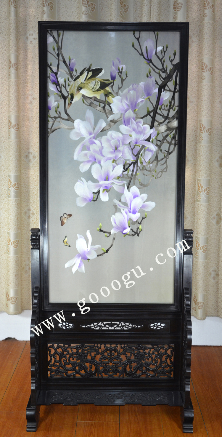 蘇繡工藝品裝飾 手工刺繡 玉蘭花鳥 紫檀木玄關