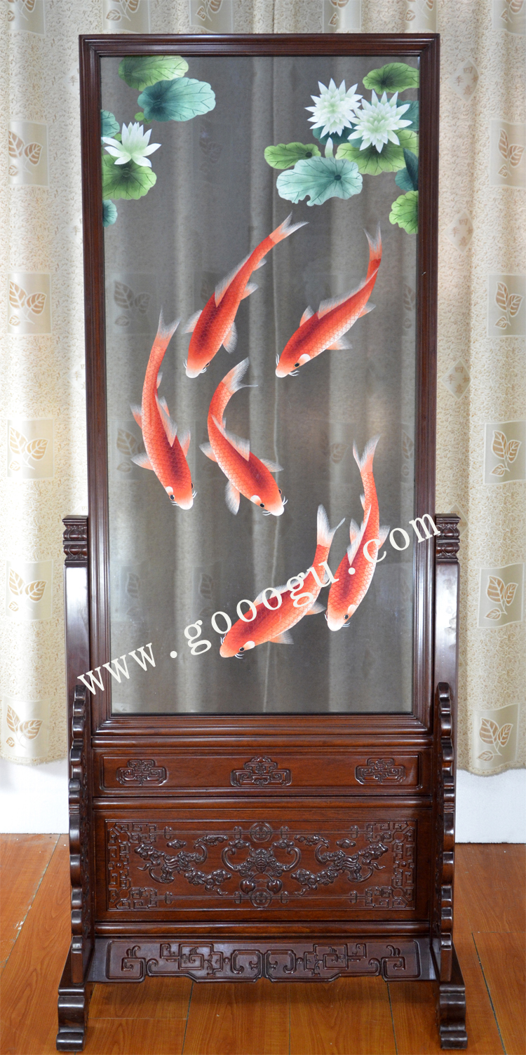 蘇繡玄關屏風 蓮花魚 紅木框架 純手工