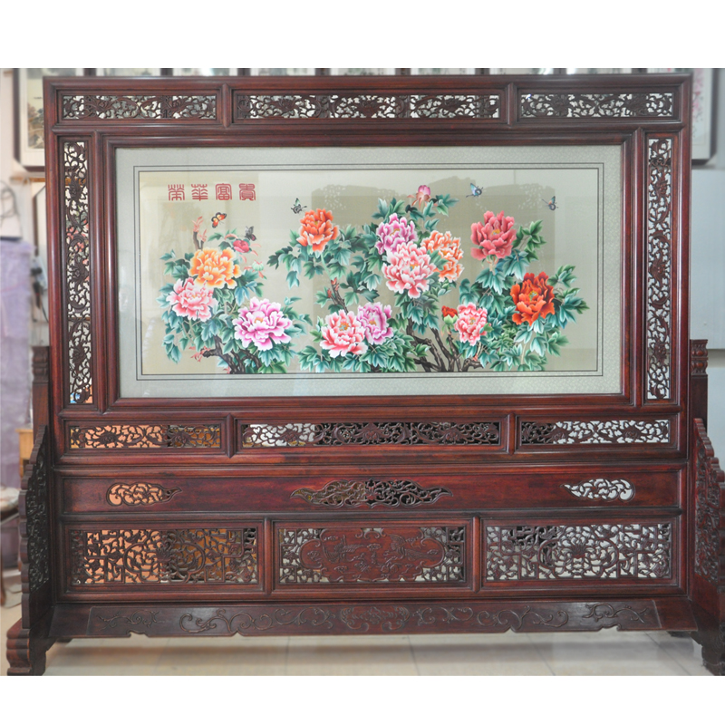 蘇繡屏風(fēng) 手工刺繡 大型四扇折疊屏風(fēng) 牡丹花 紅木工藝品