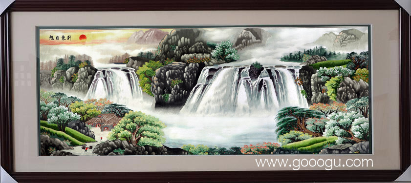 【蘇繡名稱】:旭日東升裝飾壁畫(huà) 【蘇繡規(guī)格】:60*160(圖案尺寸) 88*200CM(外框尺寸) 【蘇繡工藝】:嬌古蘇繡工藝師手工刺繡 【外框材質(zhì)】:實(shí)木框拉丁木 【絲線材質(zhì)】:蠶絲線 【蘇繡檔次】:6-8絲刺繡。 【嬌古蘇繡出廠價(jià)】:5600元(含運(yùn)費(fèi)) 【發(fā)貨方式】:由我司安排發(fā)往客人指定地點(diǎn) 【作品介紹】:開(kāi)運(yùn)風(fēng)景,作品瀑布寓意財(cái)源滾滾;左右各有兩個(gè)瀑布,寓意左右逢緣事業(yè)生機(jī)旺盛;水潭寓意聚寶盆;旭日寓意鴻運(yùn)當(dāng)頭;作品左邊之樹(shù)為招財(cái)樹(shù),右邊之樹(shù)為擋災(zāi)樹(shù);整幅作品滿含鴻運(yùn)當(dāng)頭,財(cái)運(yùn)如浩浩瀑水,生生不息之意。作品中遠(yuǎn)山層巒疊峰,更表達(dá)了旭日東升的意境。 【細(xì)節(jié)欣賞一】 .jpg)