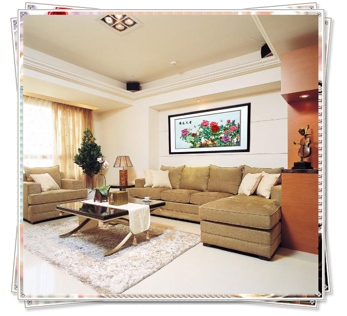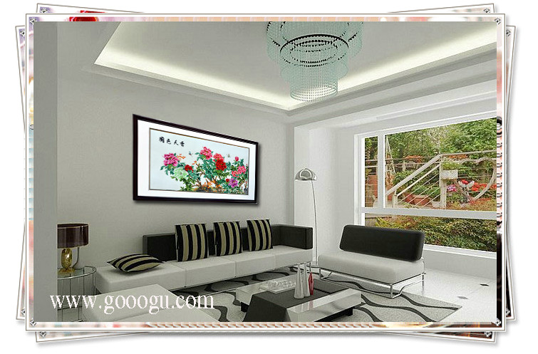 【蘇繡名稱(chēng)】:國(guó)色天香裝飾壁畫(huà) 【蘇繡規(guī)格】:60*160(圖案尺寸) 88*200CM(外框尺寸) 【蘇繡工藝】:嬌古蘇繡工藝師 【外框材質(zhì)】:實(shí)木框拉丁木 【絲線材質(zhì)】:蠶絲線 【蘇繡檔次】:6-8絲刺繡。 【嬌古蘇繡出廠價(jià)】:5200元(含運(yùn)費(fèi)) 【發(fā)貨方式】:由我司安排發(fā)往客人指定地點(diǎn) 【細(xì)節(jié)欣賞】