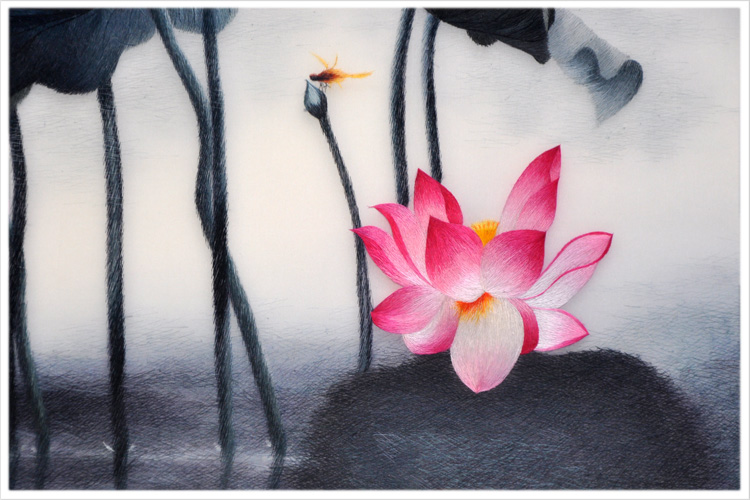 【品 牌】:嬌古 (作品代碼 D-1026) 【品 名】:水墨荷花裝飾畫 【品 質(zhì)】:2-4絲刺繡 (蘇繡小知識:1根蘇繡絲線可分為16絲,中檔刺繡皆為10絲所繡,中高檔刺繡皆為6-8絲,高檔刺繡皆為4-6絲,精品刺繡皆為1-4絲) 【尺 寸】:畫心尺寸60*60cm 整體尺寸90*90cm 【產(chǎn)品工藝】:手工刺繡 【絲線材質(zhì)】:蠶絲線 真絲面料 【用 途】:政府禮品、外賓禮品、生日禮物、賀壽禮品、領(lǐng)導(dǎo)升遷、出國禮品等等。 【出廠價(jià)格】:4800元 【細(xì)節(jié)圖】