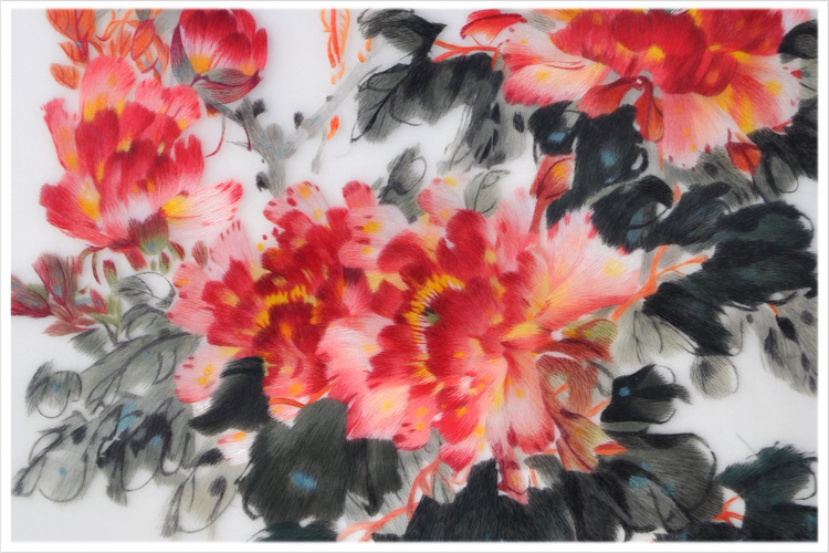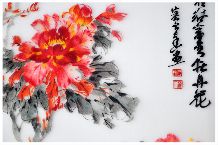 【品 牌】:嬌古 (作品代碼 D-1025) 【品 名】:國花牡丹裝飾畫(手工蘇繡) 【品 質(zhì)】:2-4絲刺繡 (蘇繡小知識:1根蘇繡絲線可分為16絲,中檔刺繡皆為10絲所繡,中高檔刺繡皆為6-8絲,高檔刺繡皆為4-6絲,精品刺繡皆為1-4絲) 【尺 寸】:畫心尺寸55*100cm 整體尺寸75*135cm 【產(chǎn)品工藝】:手工刺繡 【絲線材質(zhì)】:蠶絲線 【用 途】:居家裝飾或送政府禮品、外賓禮品、生日禮物、賀壽禮品、領(lǐng)導(dǎo)升遷、出國禮品等等。 【出廠價格】:16000元 【細(xì)節(jié)圖】