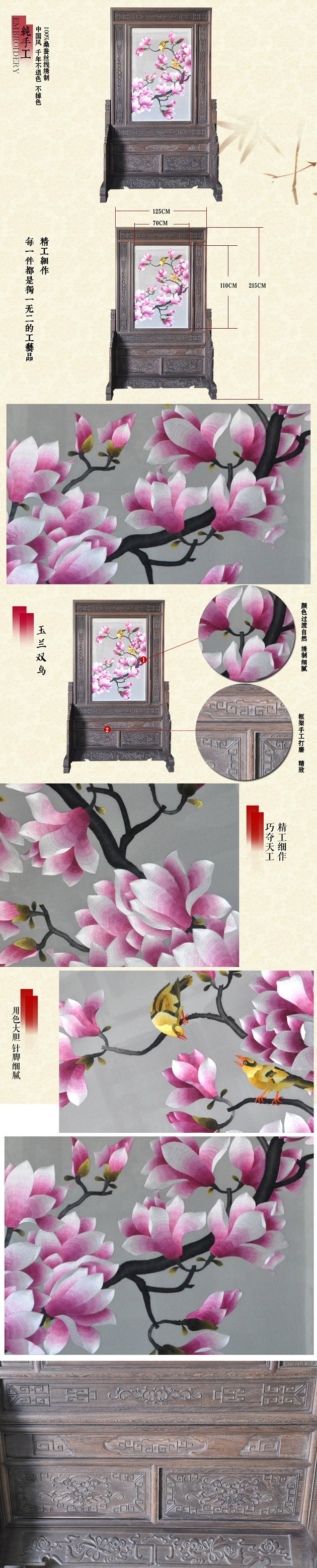 【產(chǎn)品名稱】:紅玉蘭花鳥(雙面繡) (作品代碼:p-1522) 【產(chǎn)品規(guī)格】:圖案尺寸寬70cm,高110cm 外框整體尺寸寬125cm,高215cm 【產(chǎn)品工藝】:手工刺繡 【產(chǎn)品材質(zhì)】:真絲面料+雞翅木+桑蠶絲線+玻璃 【產(chǎn)品包裝】:木箱包裝,用海綿包扎,確保運輸安全 【出廠價】:15800元 【產(chǎn)品運輸】:我司負責發(fā)往客戶指定地點,蘇州附近城市可送貨上門! 【產(chǎn)品說明】:紅玉蘭花鳥雙面繡屏風,是由蘇州工藝師耗時數(shù)個月精心手工刺繡而成,刺繡圖案以紅玉蘭花鳥為題材繡工精細,簡約大方,顏色搭配均勻過渡自然,屏風的框架選用進口的雞翅木為料,是蘇繡屏風中的珍稀作品。是居家和辦公的裝飾品之一!歡迎親臨嬌古蘇繡展示廳觀看實物!